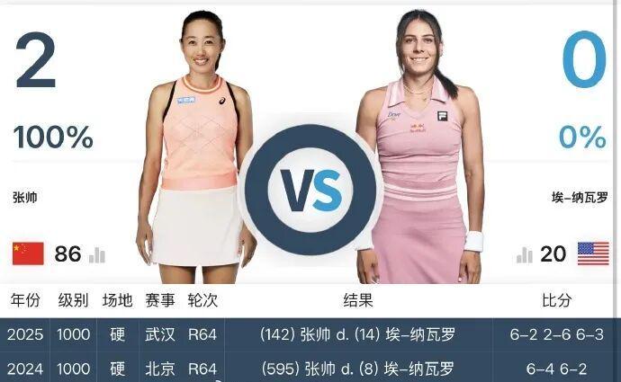 下一轮她的对手是卫冕冠军纳瓦罗,此前张帅在与她的2次交手中都取得了胜利。(2024年中网、2025年武网)